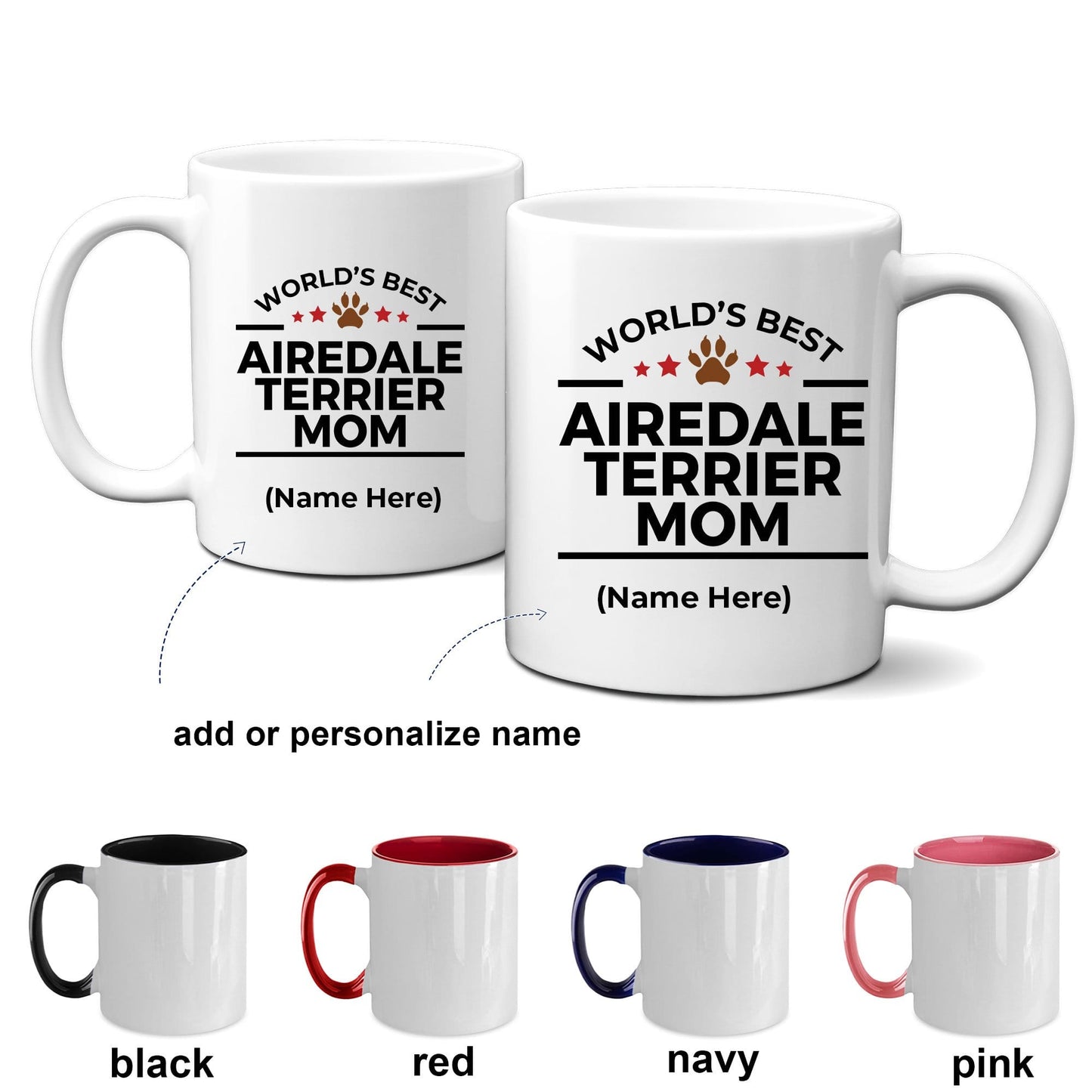 Airedale Terrier Dog Mom ceramic mugs come in both 11 and 15 ounces which is great for coffee, tea, hot chocolate, milk, or any other beverage. The two tones mugs are available in black, red, navy, and pink. Design is also available in the 14oz travel mug. Just message me if you want a different product. The design can also be personalized or changed, such as to grandma, grandpa, brother, sister, etc. Just message me if you want a different product or customization.