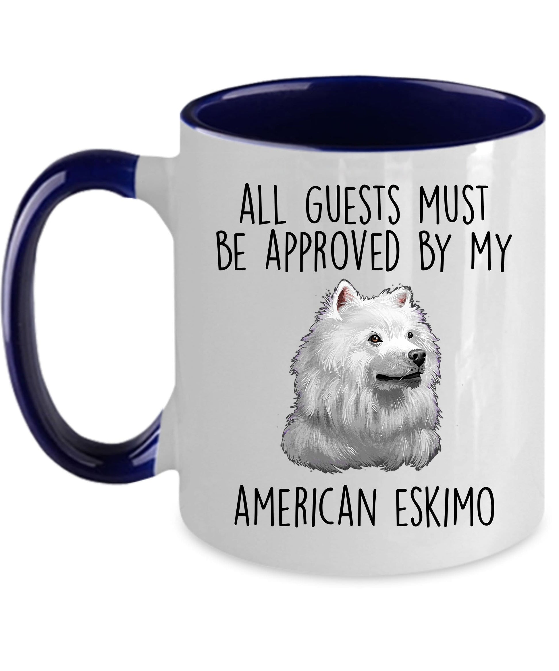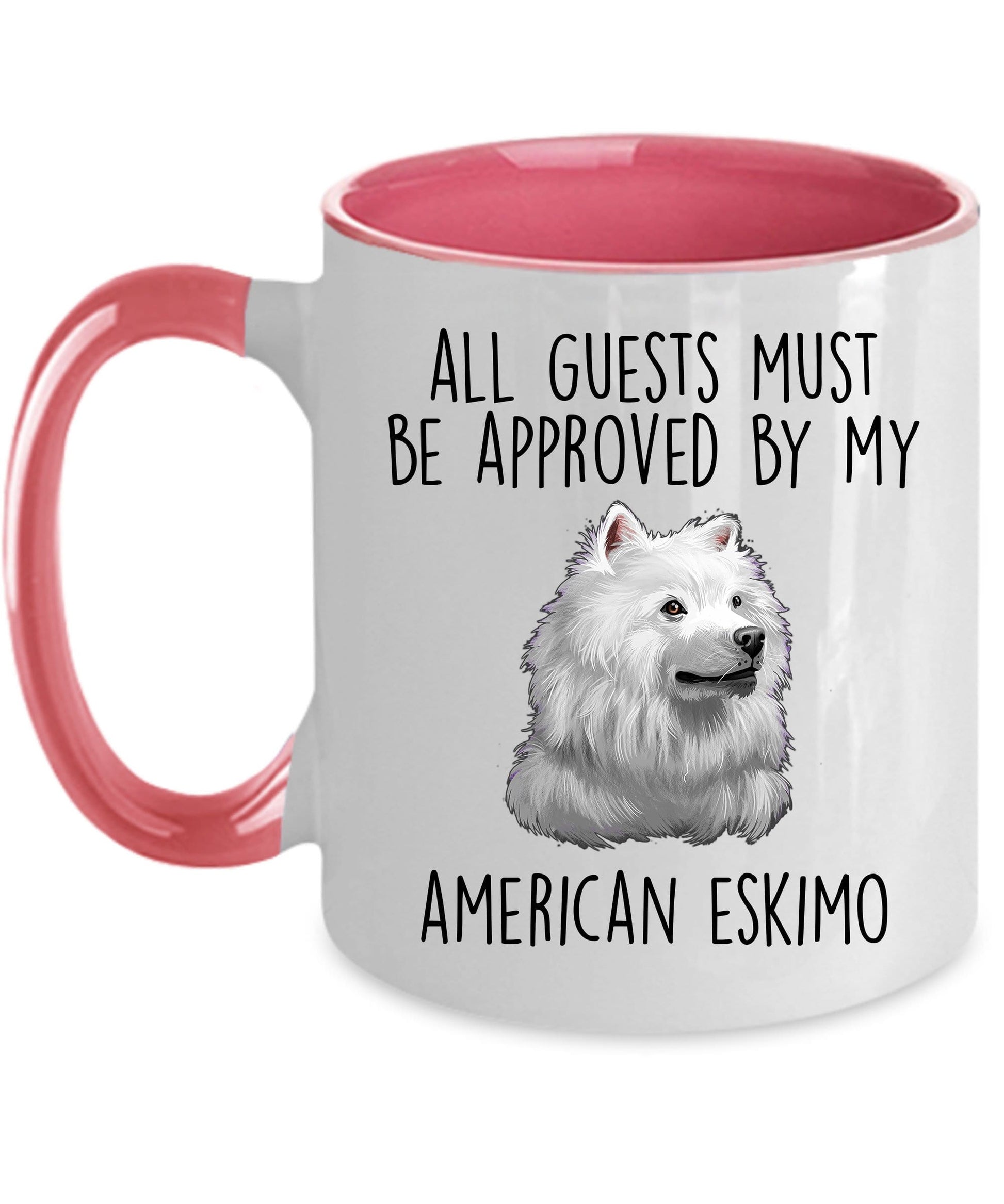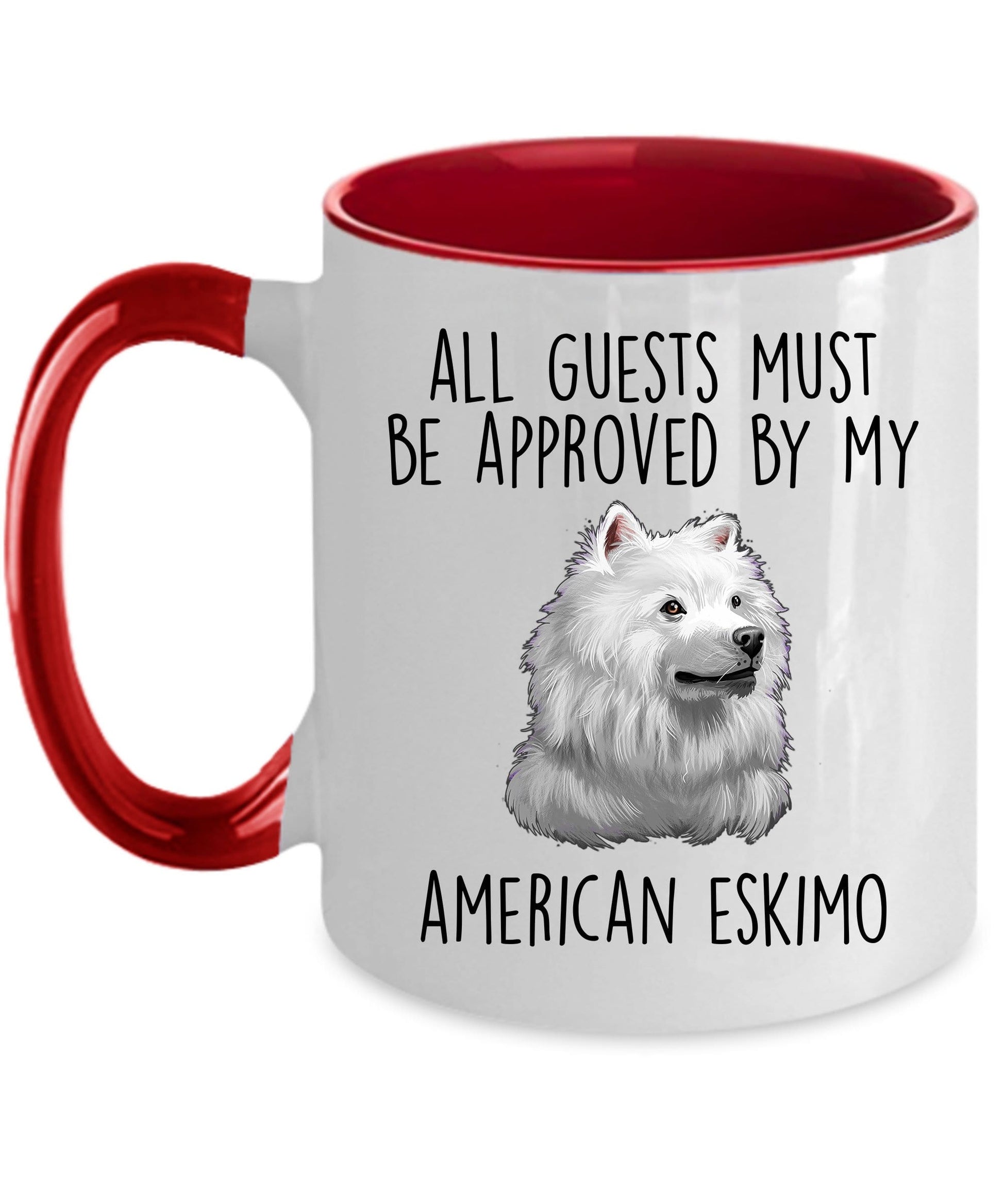 American Eskimo Dog Ceramic Coffee Mug Guests Must Be Approved come in both 11 and 15 ounces which is great for coffee, tea, hot chocolate, milk, or any other beverage. The two-tone mugs are available in black, red, navy, and pink. Design is also available in the 14oz travel mug.