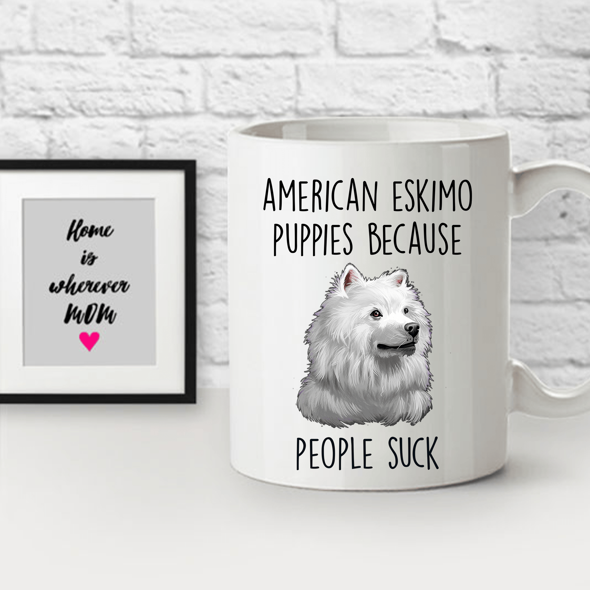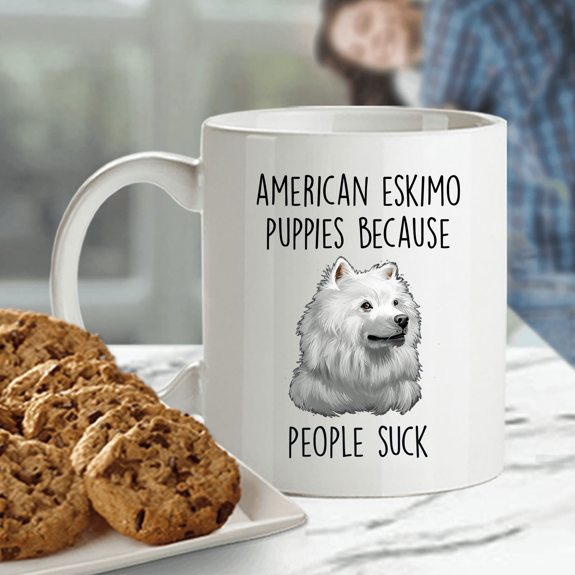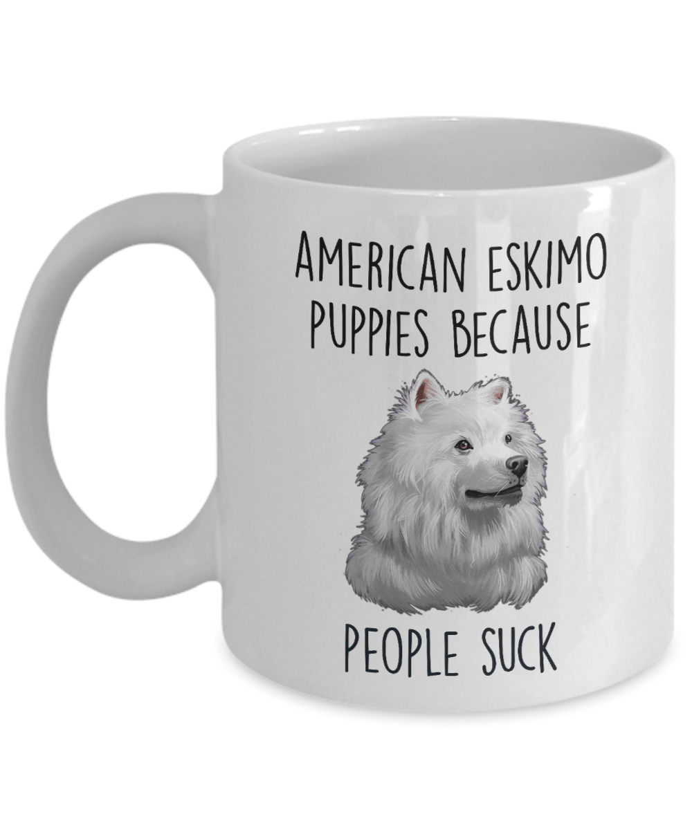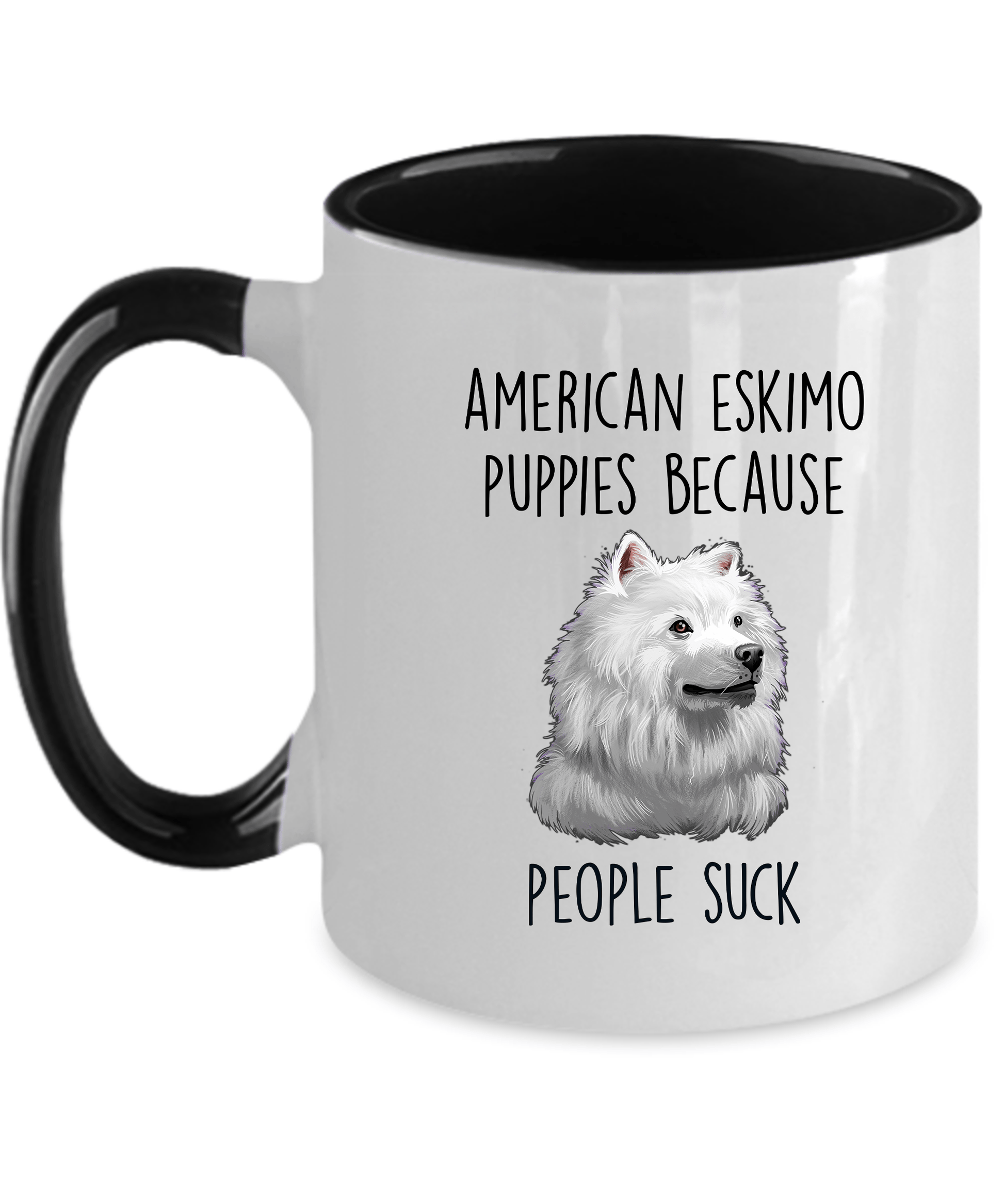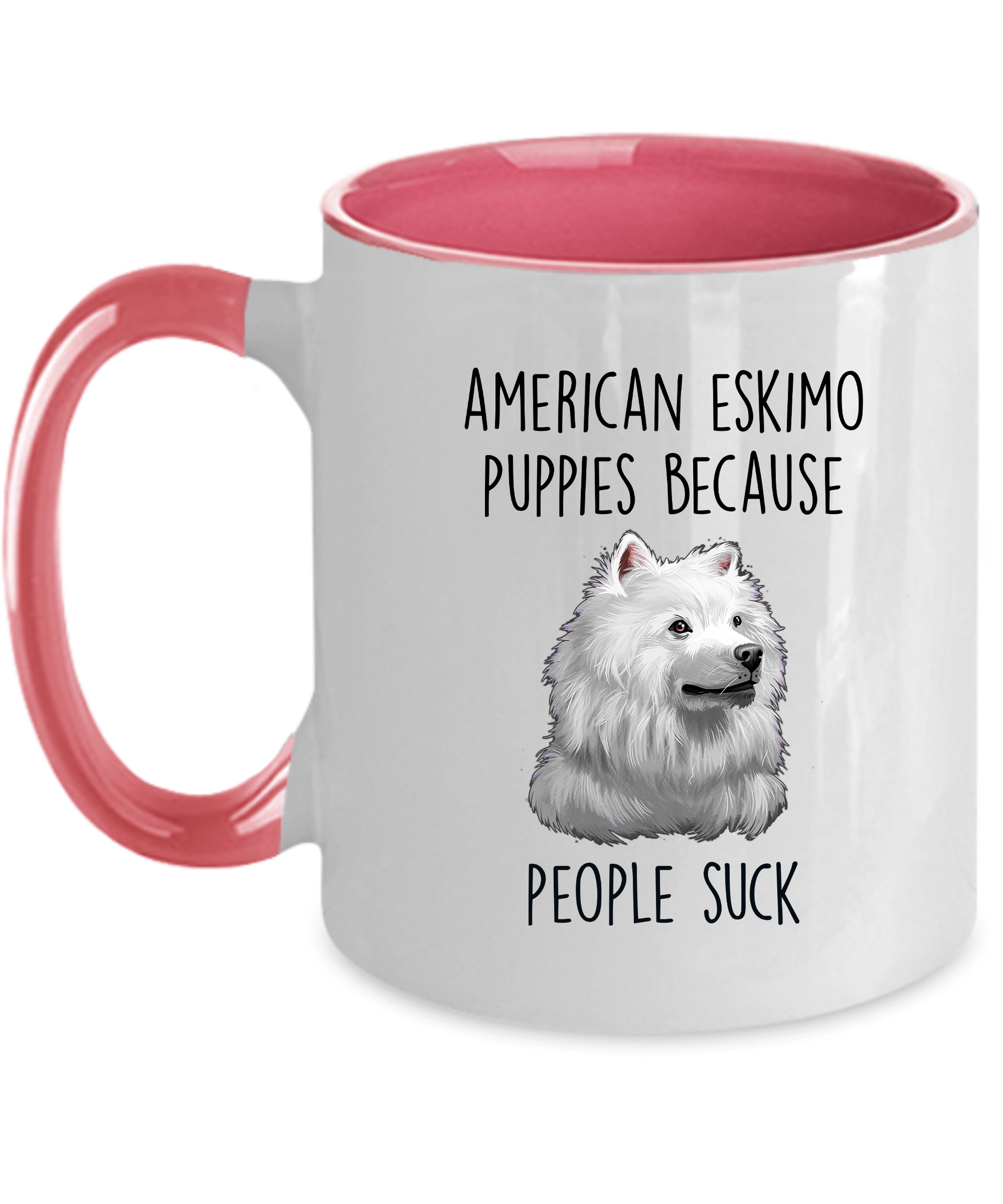 American Eskimo Puppies Because People Suck Funny ceramic mugs come in both 11 and 15 ounces which is great for coffee, tea, hot chocolate, milk, or any other beverage. The two-tone mugs are available in black, red, navy, and pink. Design is also available in the 14oz travel mug.