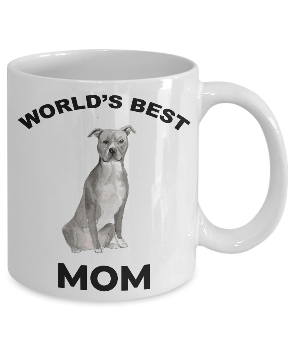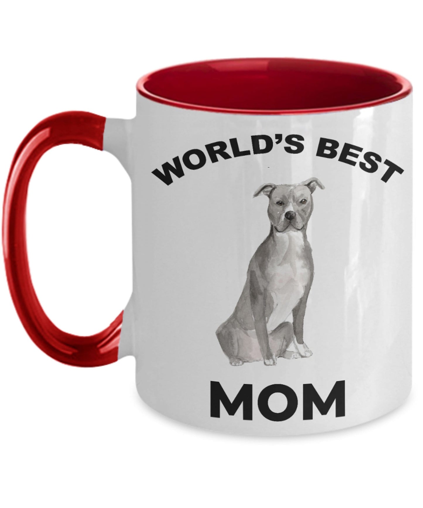 These American Staffordshire Terrier Best Dog Mom ceramic mugs come in both 11 and 15 ounces which is great for coffee, tea, hot chocolate, milk or any beverage.The two tones mugs only come in the 11 oz size.