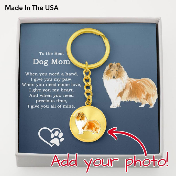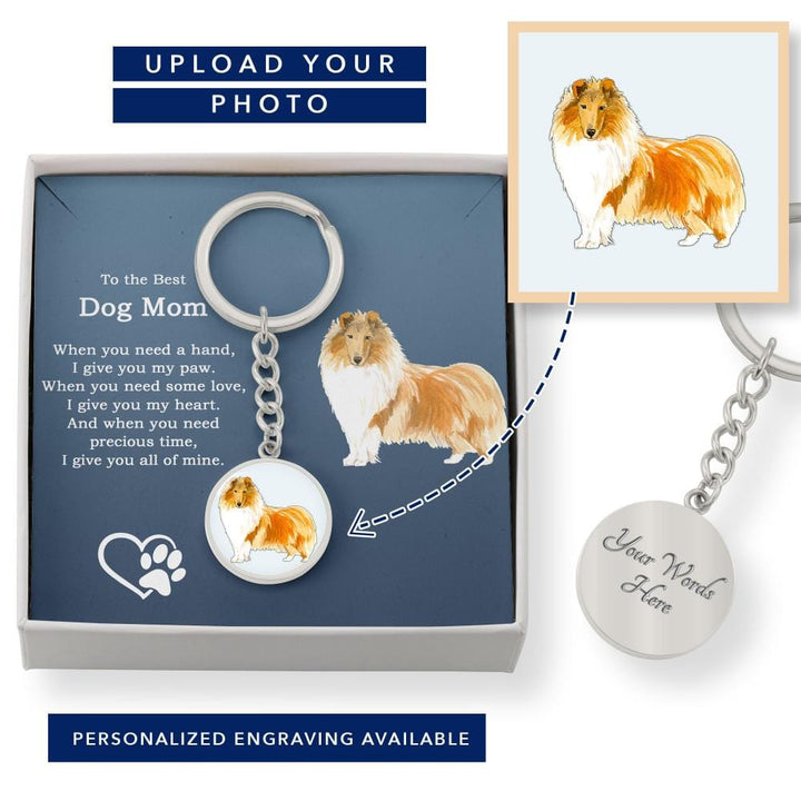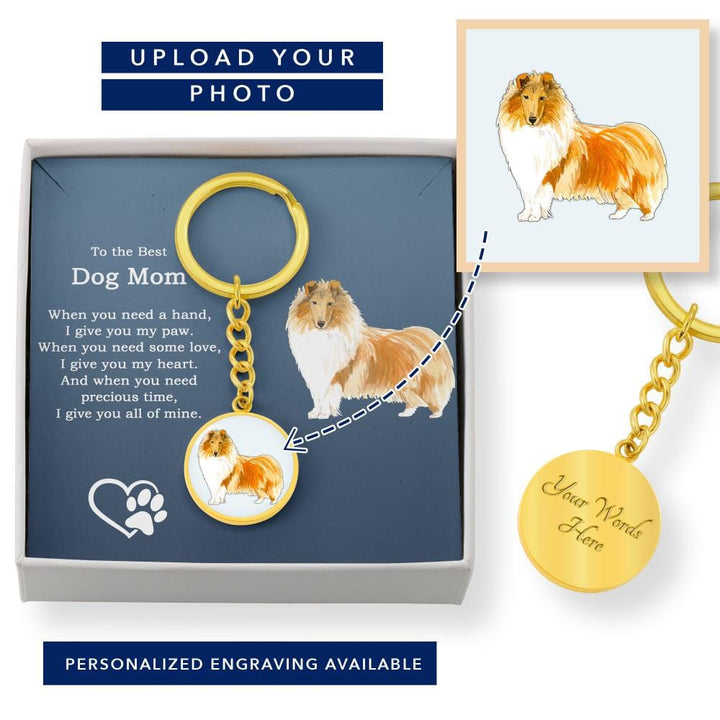 Best Dog Mom Custom Photo and Engraved Back Circle Pendant Keychain Message Card features a custom photo upload on the keychain and message card. Can be personalized with the Pet's name as well. ( The Remembrance version is also available.)