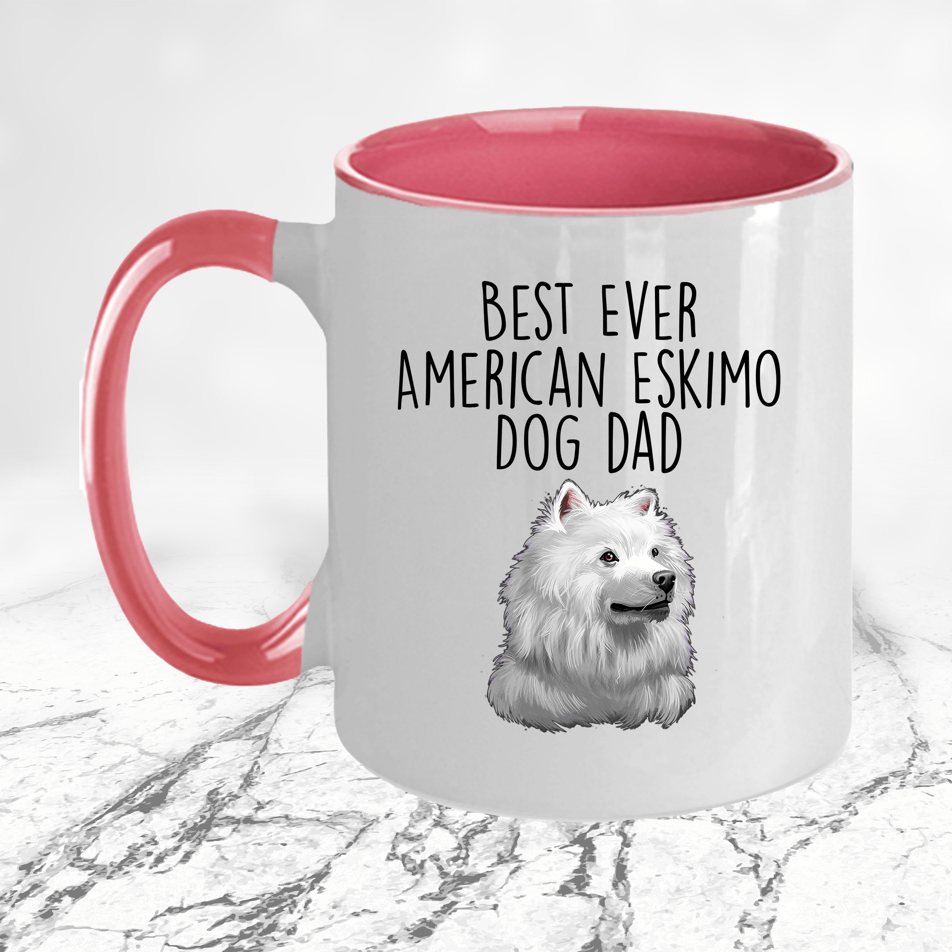 Best Ever American Eskimo Dog Dad ceramic mugs come in both 11 and 15 ounces which is great for coffee, tea, hot chocolate, milk, or any other beverage. The two-tone mugs are available in black, red, navy, and pink. Design is also available in the 14oz travel mug.