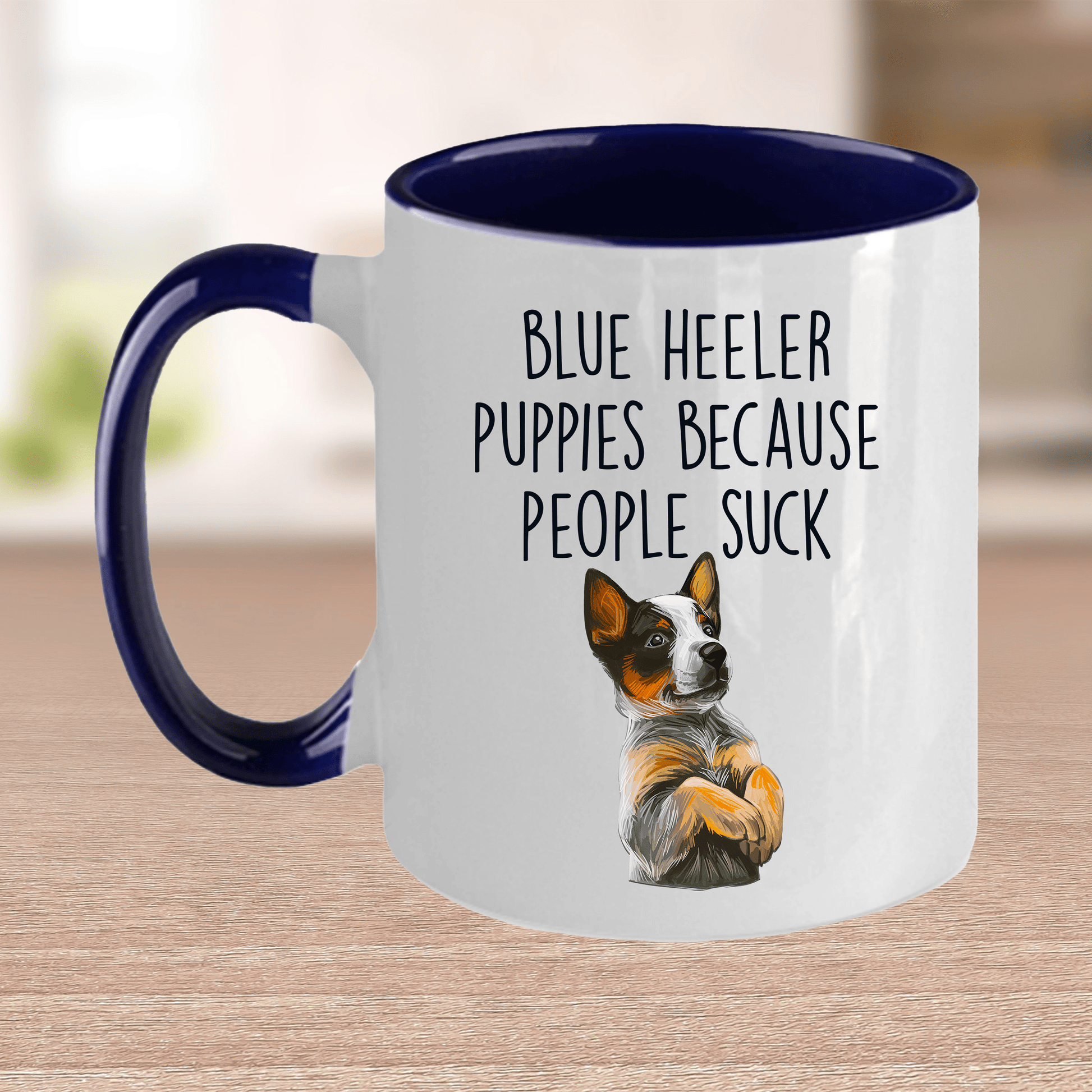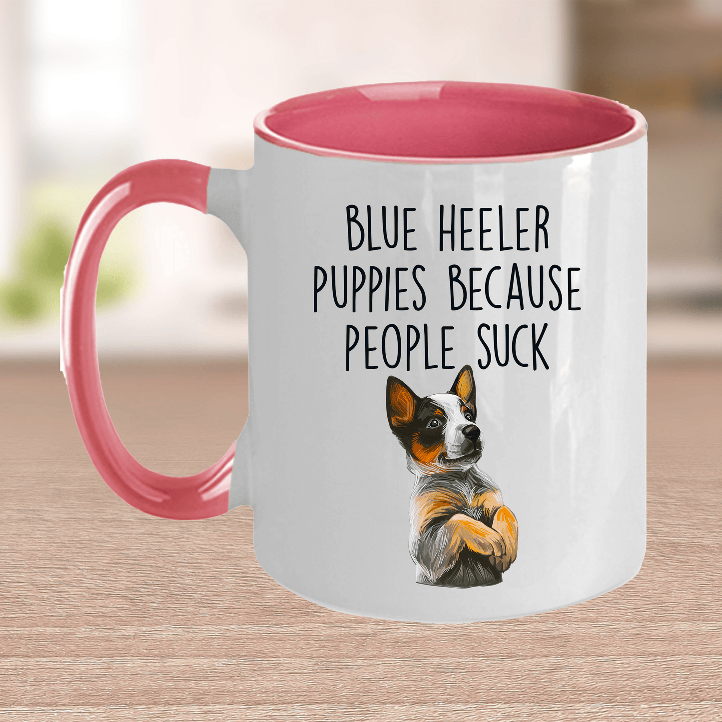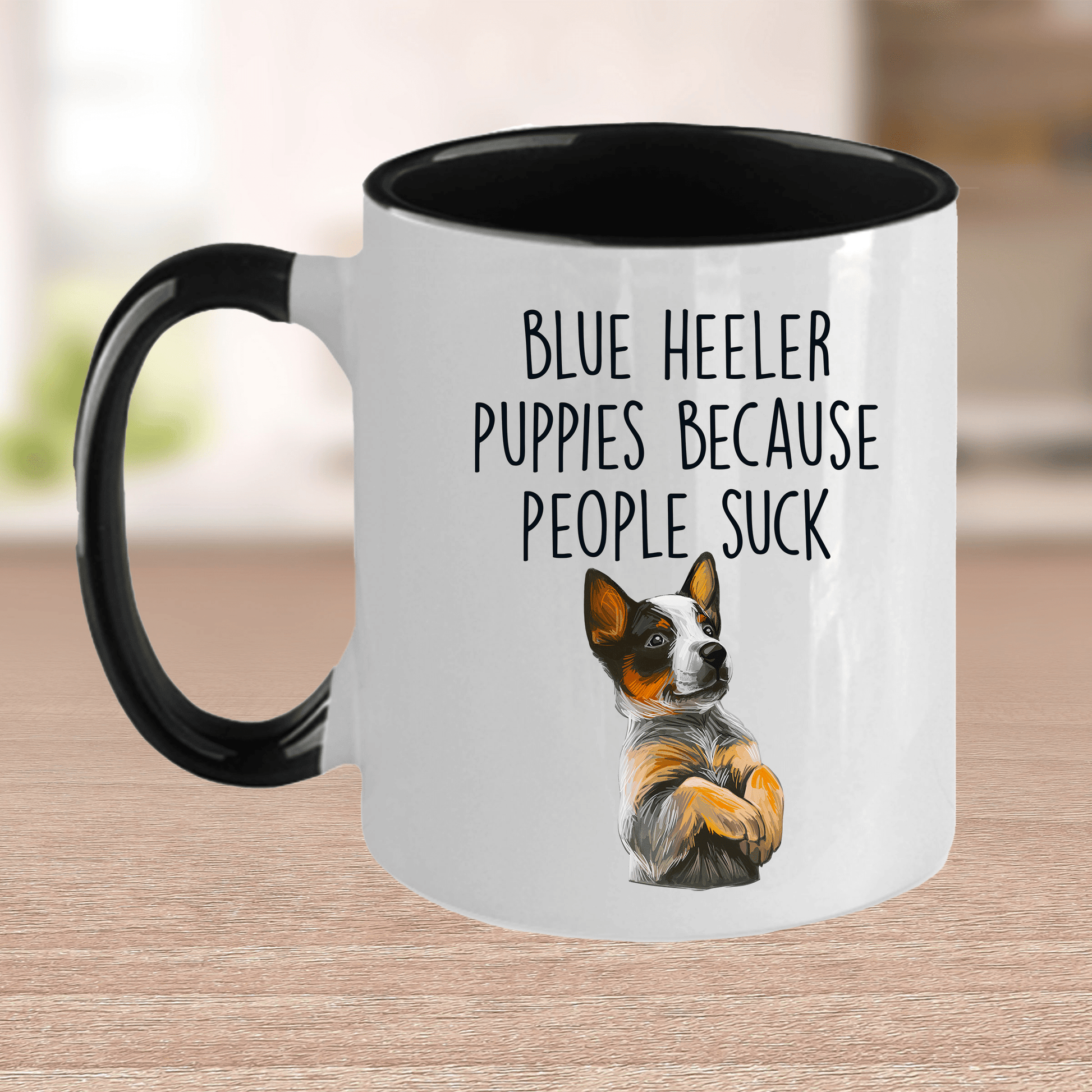 Blue Heeler Puppies Because People Suck Funny ceramic mugs come in both 11 and 15 ounces which is great for coffee, tea, hot chocolate, milk, or any other beverage. The two-tone mugs are available in black, red, navy, and pink. Design is also available in the 14oz travel mug.
