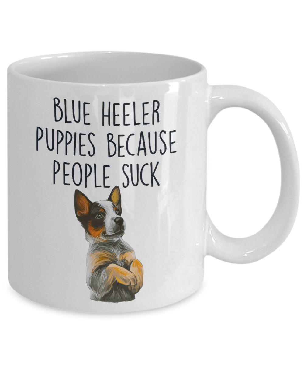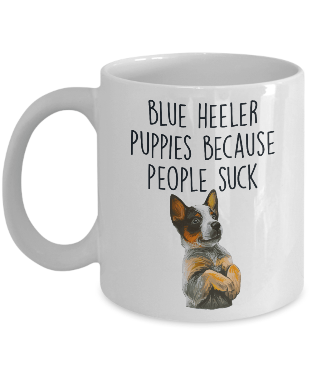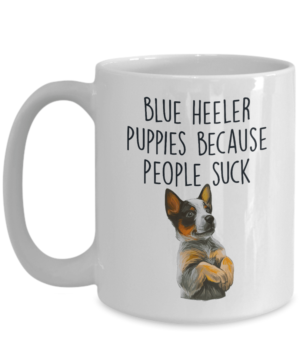 Blue Heeler Puppies Because People Suck Funny ceramic mugs come in both 11 and 15 ounces which is great for coffee, tea, hot chocolate, milk, or any other beverage. The two-tone mugs are available in black, red, navy, and pink. Design is also available in the 14oz travel mug.