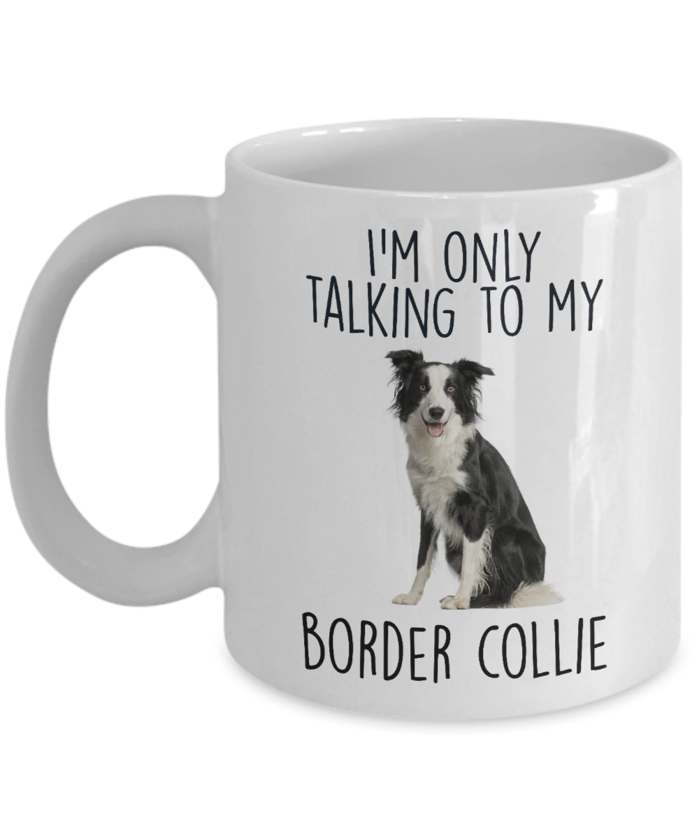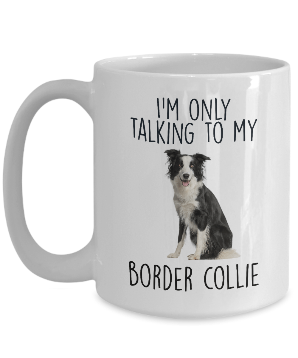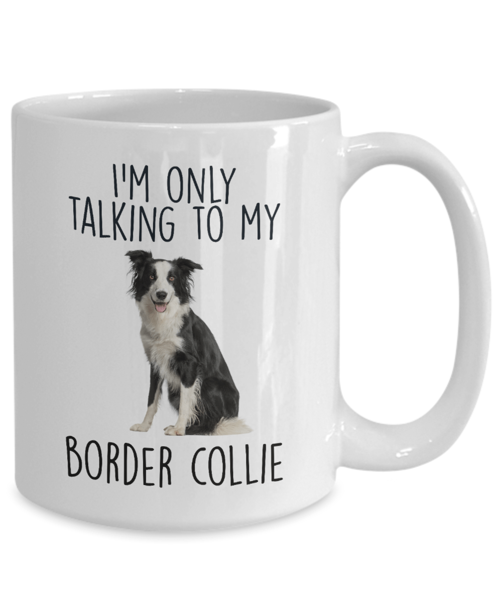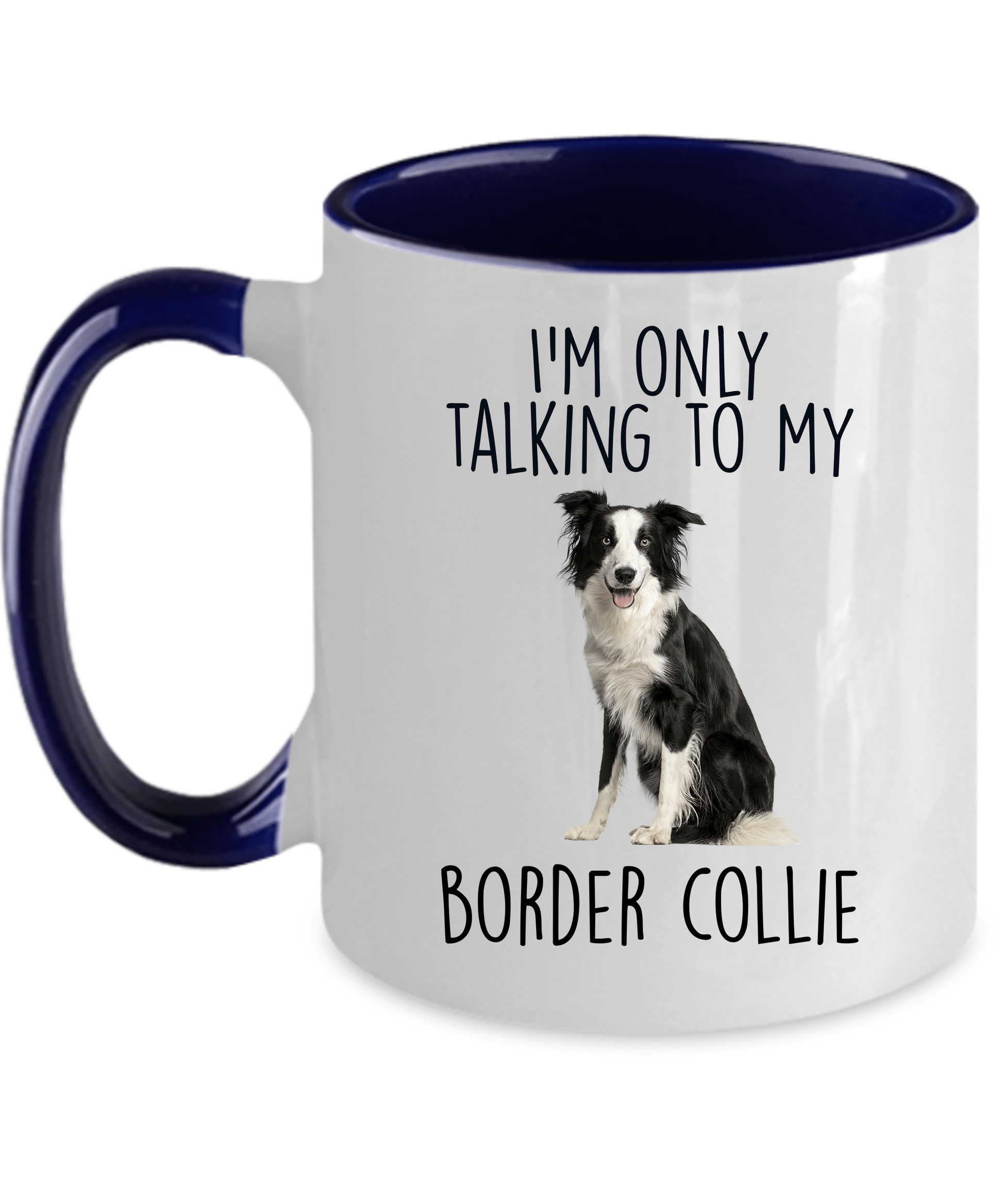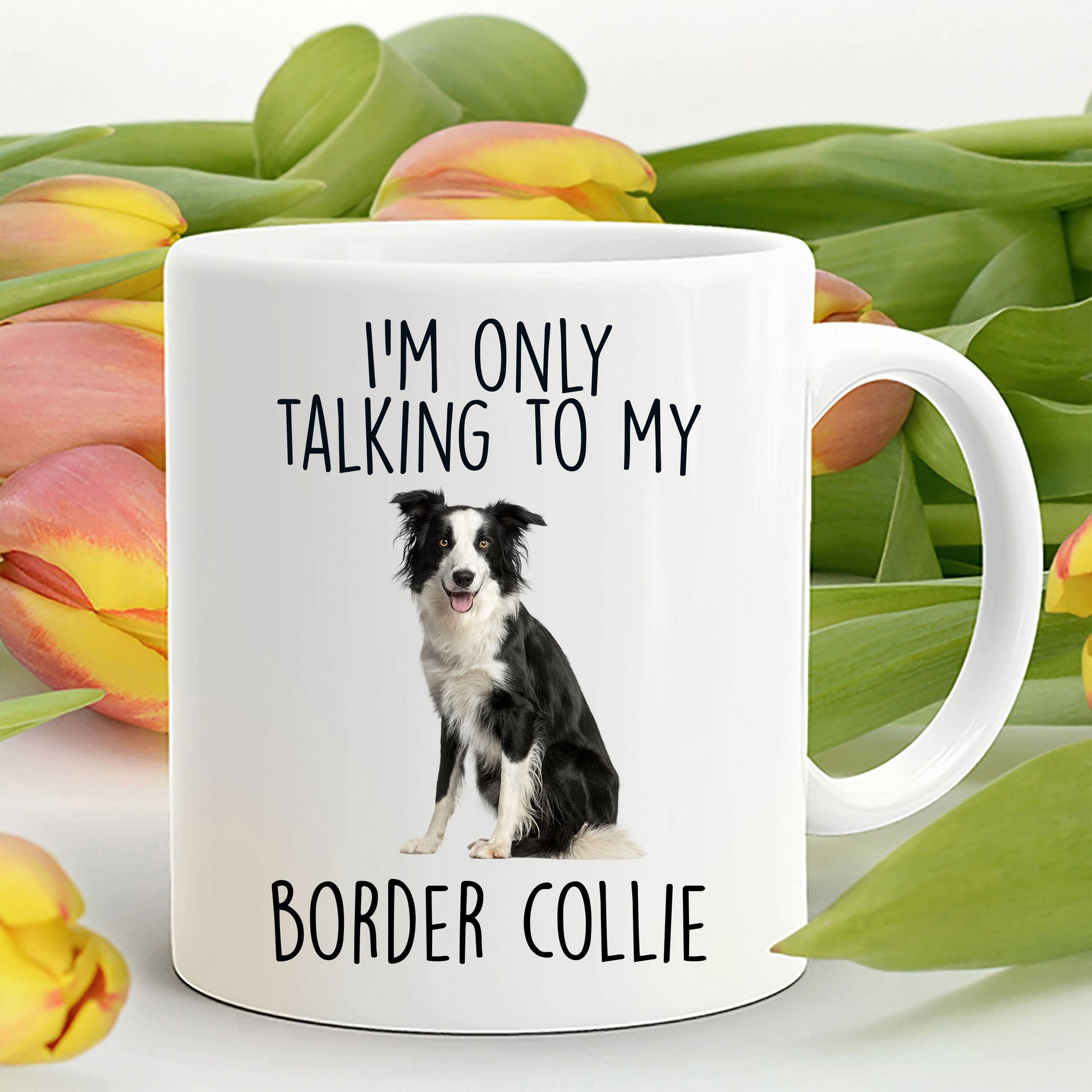 Border Collie Ceramic Coffee Mug I'm only talking to my dog come in both 11 and 15 ounces which is great for coffee, tea, hot chocolate, milk, or any other beverage. The two tones mugs are available in black, red, navy, and pink. Design is also available in the 14oz travel mug and the 20oz and 30oz polar laser-etched color tumblers. Just message me if you want a different product.