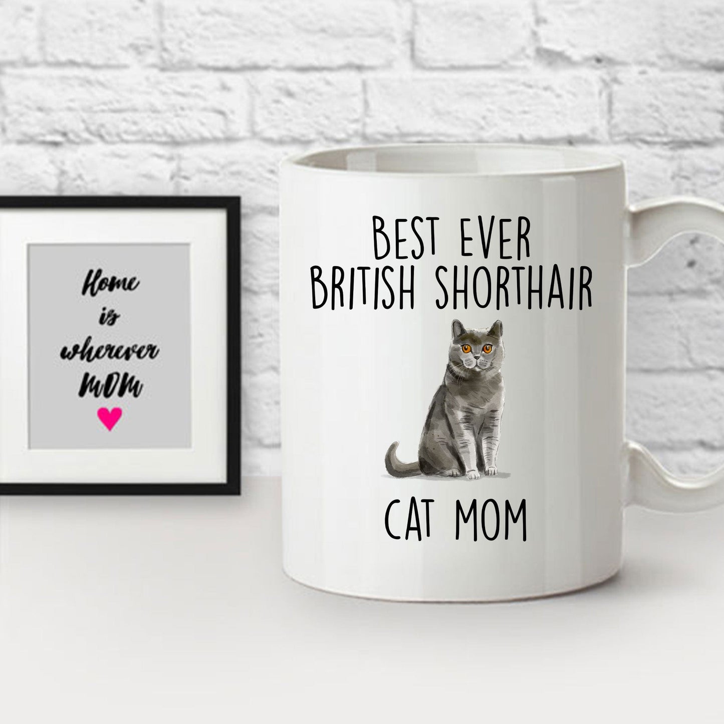 The British Shorthair Cat Mom mugs are printed using sublimation heat transfer paper using special inks or dyes. The image is printed in reverse and then placed on the mug and a special printer uses heat and pressure to transfer the image to the polyester coated mug. The heat transforms the ink into a gas allowing it to permanently permeate the surface of the mug ensuring a lasting print of custom art.