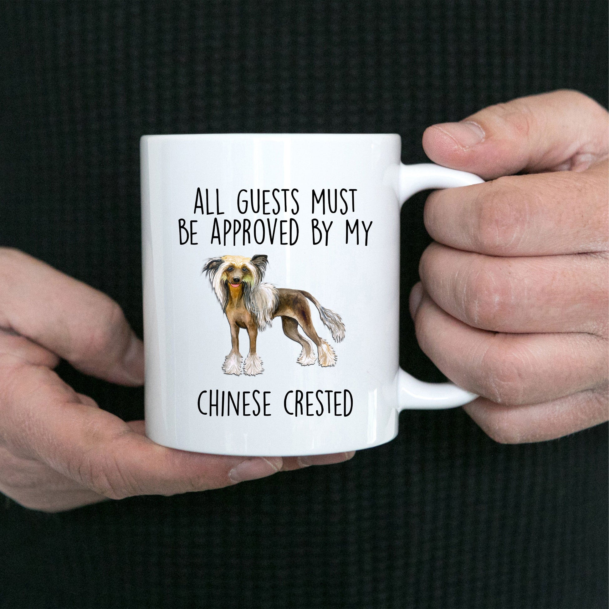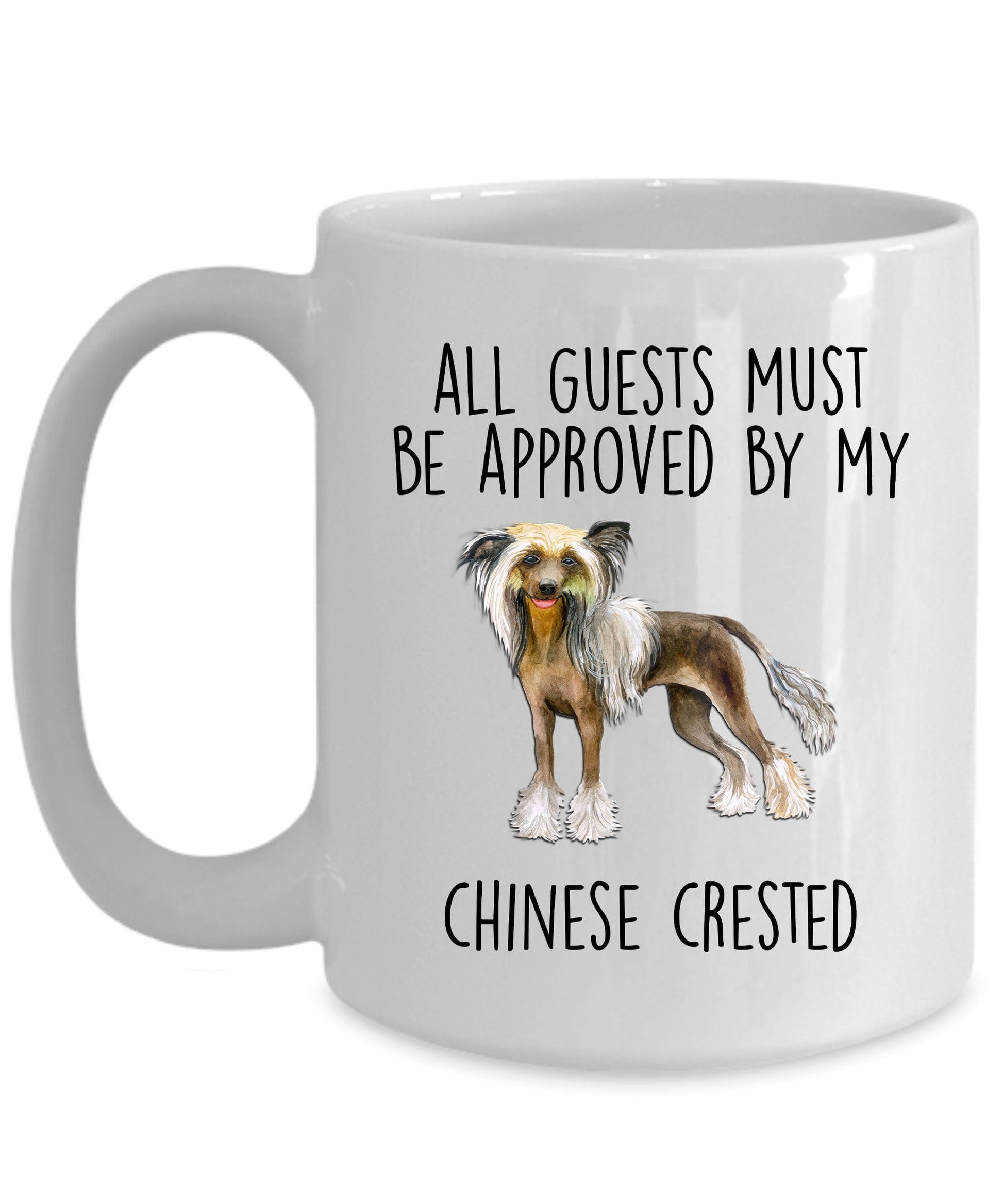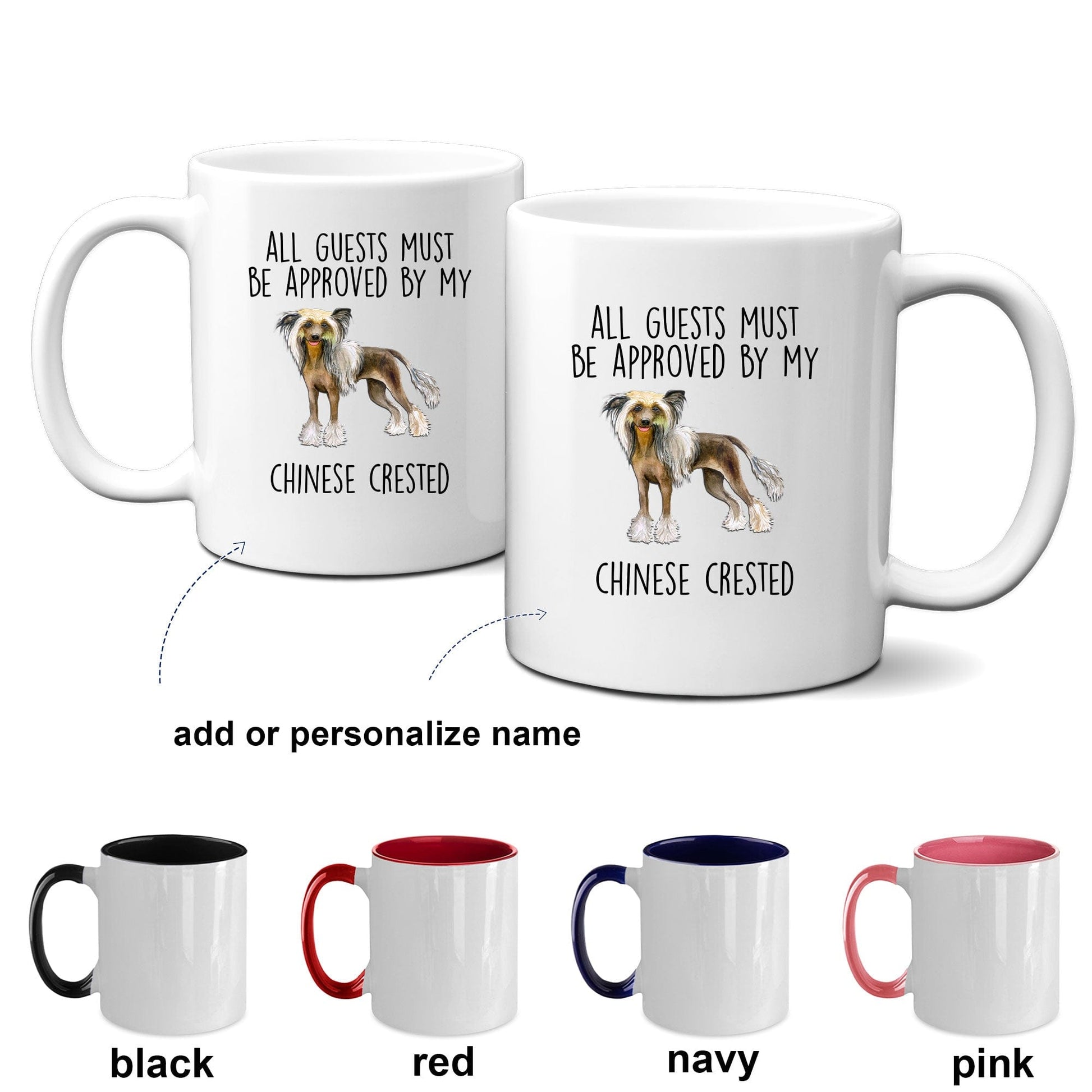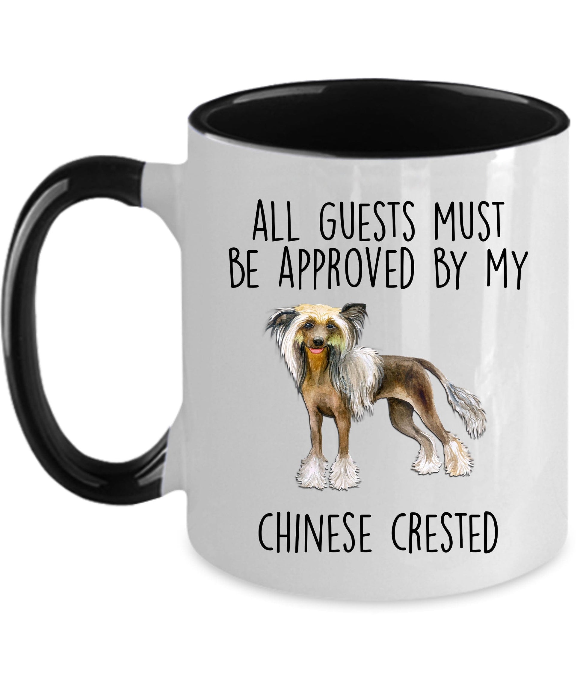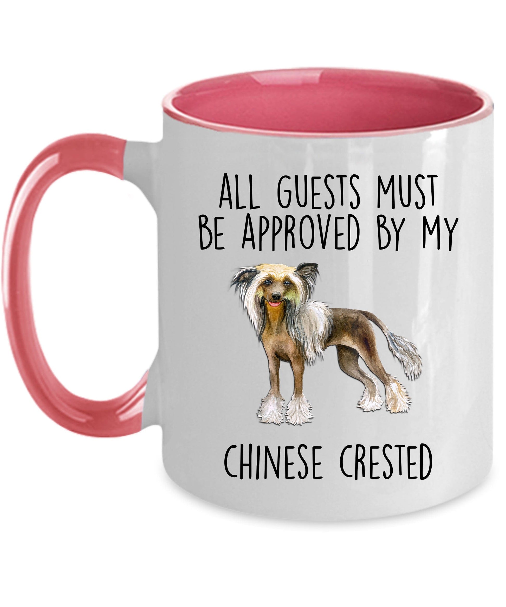 Chinese Crested Dog Funny Ceramic Coffee Mug - All guests must be approved by my Chinese Crested. These ceramic mugs come in both 11 and 15 ounces which is great for coffee, tea, hot chocolate, milk, or any other beverage. The two tones mugs are available in black, red, navy, and pink. Design is also available in the 14oz travel mug and the 20oz and 30oz polar laser-etched color tumblers. Just message me if you want a different product. The design can also be personalized or changed, such as to grandma, grandpa, brother, sister, etc. Just message me if you want a different product or customization.