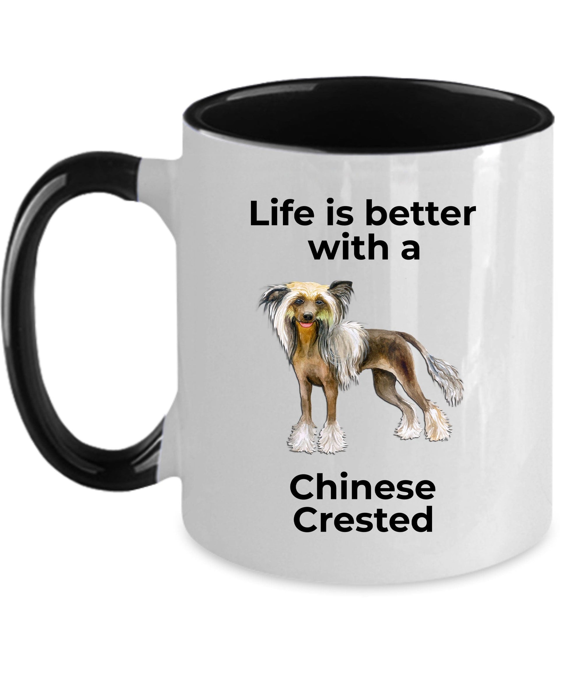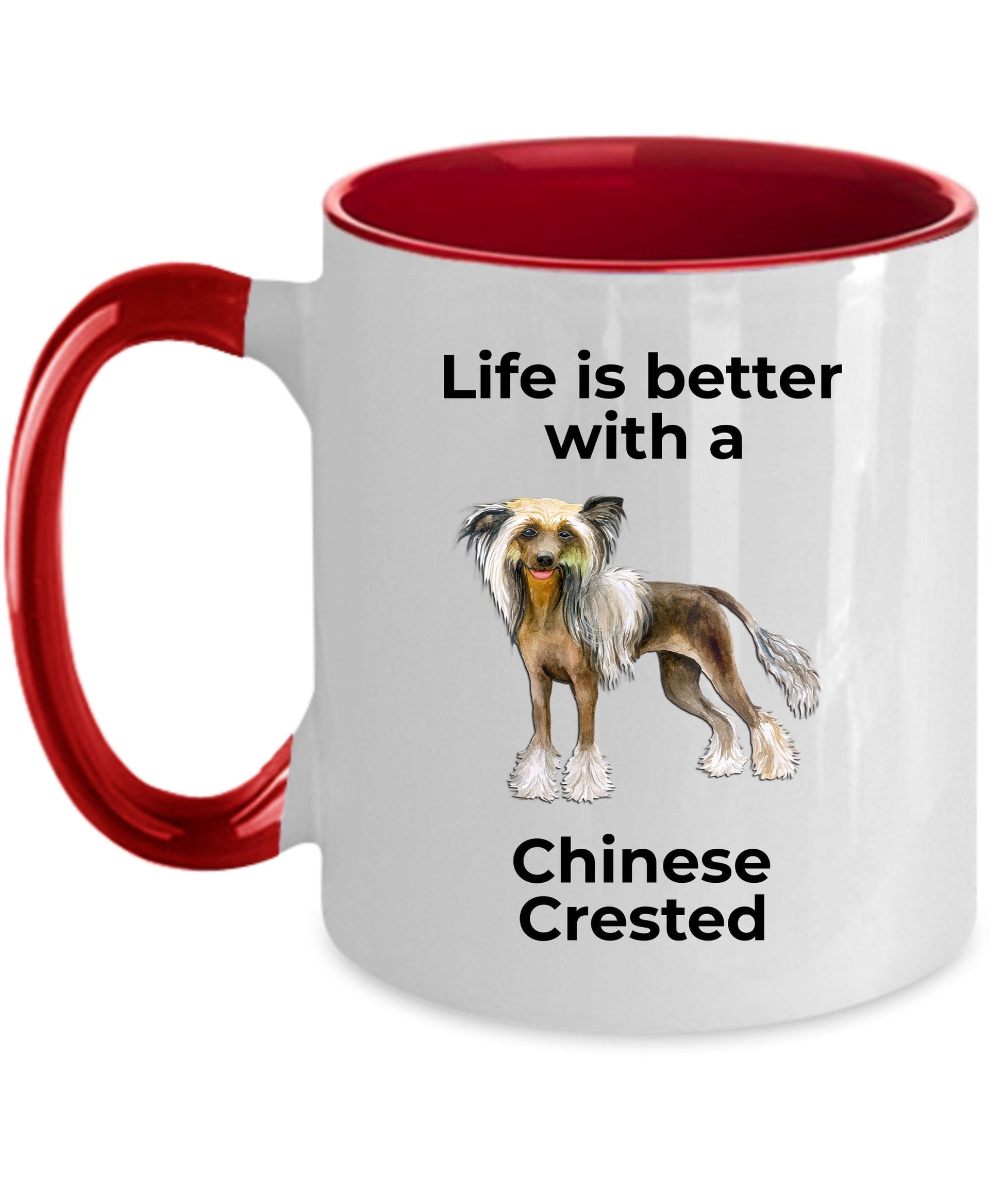 Chinese Crested Dog ceramic mugs come in both 11 and 15 ounces which is great for coffee, tea, hot chocolate, milk, or any other beverage. The two tones mugs are available in black, red, navy, and pink. Design is also available in the 14oz travel mug and the 20oz and 30oz polar laser-etched color tumblers. Just message me if you want a different product.