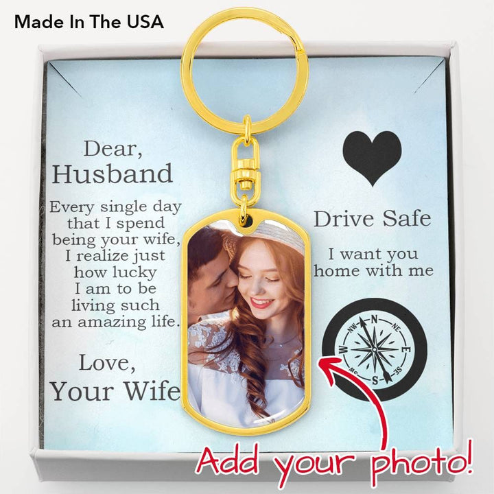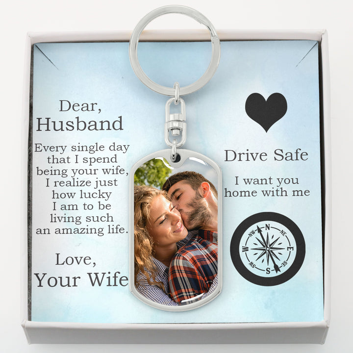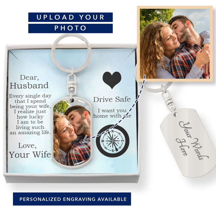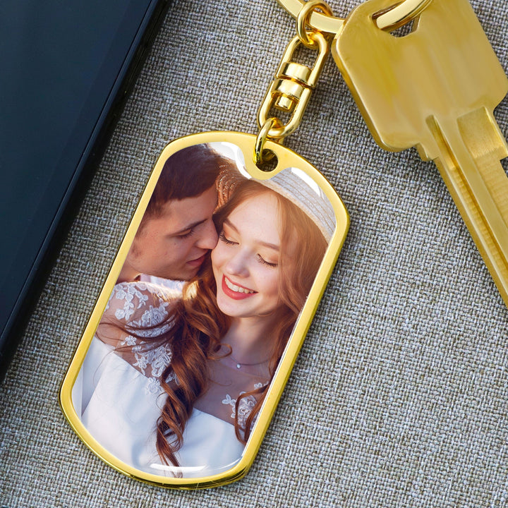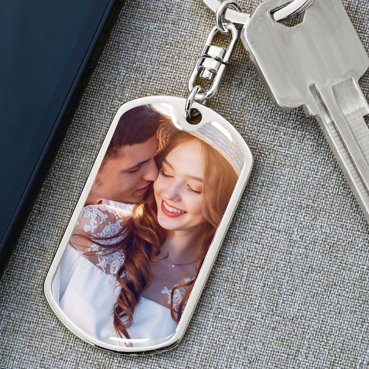 Our Custom Photo and Engraved back Military Style Dog Tag Keychain makes a great gift for your husband for Valentine's day, his birthday, your anniversary, or any special occasion. Upload your own photo and engrave a personal message or date on the back.