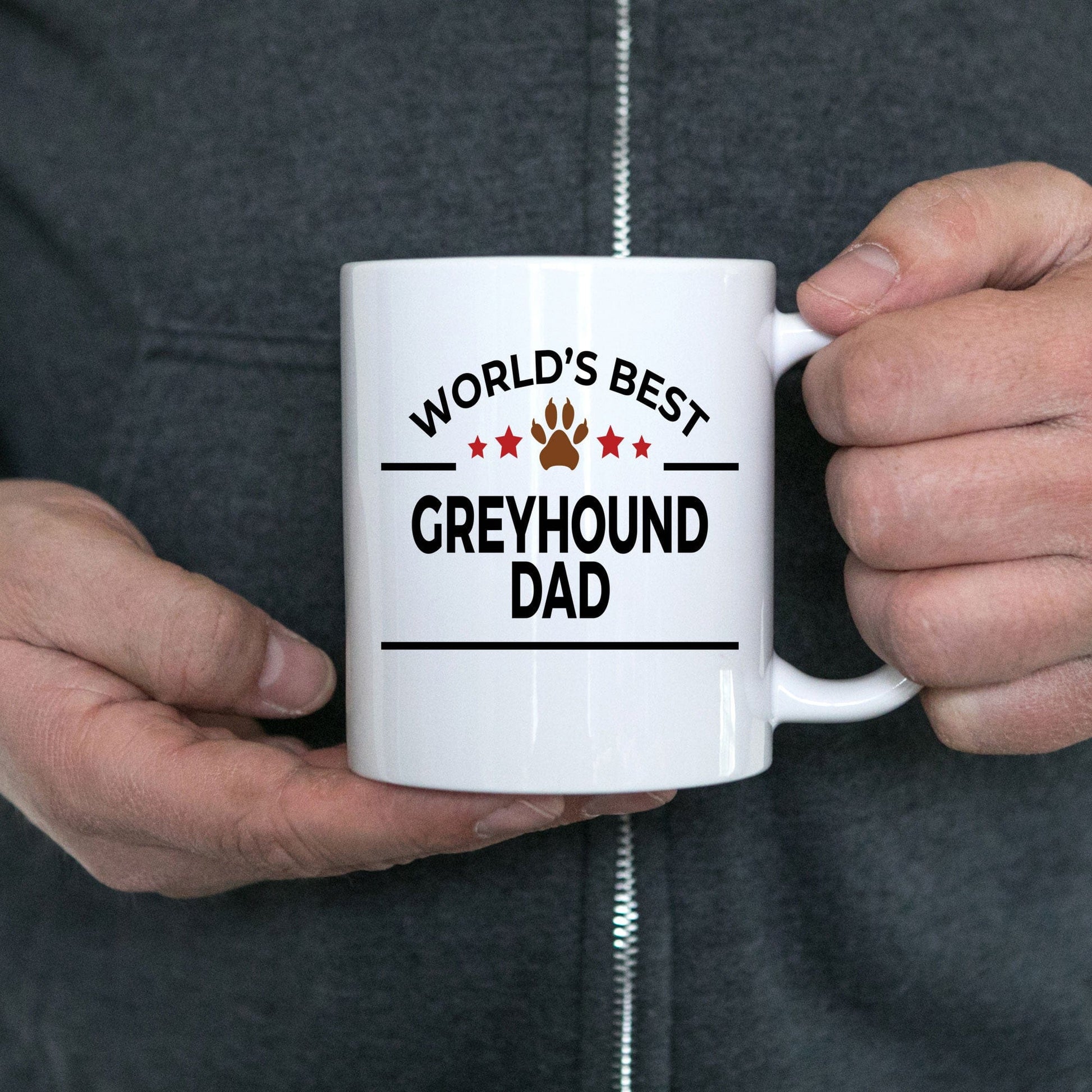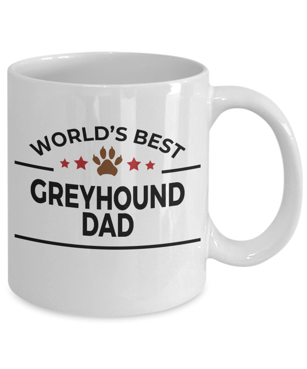 These Greyhound Dog Dad Mugs come in both 11 and 15 ounces which is great for coffee, tea, hot chocolate, milk or any other beverage and has a large C-handle that is easy to grip. The design is printed on both sides so is a suitable gift for right as well as left handed people.