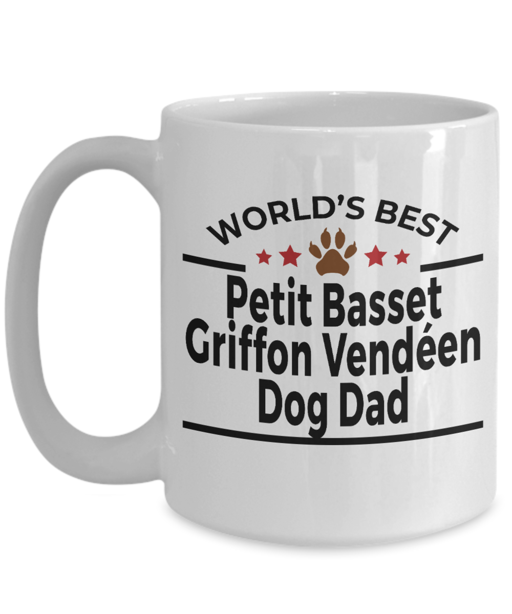 Petit Basset Griffon Vendéen Dog Dad These Mugs come in both 11 and 15 ounces which is great for coffee, tea, hot chocolate, milk or any other beverage and has a large C-handle that is easy to grip. The design is printed on both sides so is a suitable gift for right as well as left handed people.